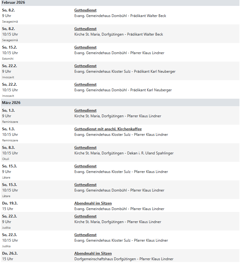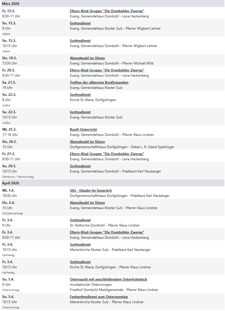 Herzlich Willkommen auf der neuen Website der Kirchengemeinden Dombühl, Kloster Sulz und Dorfgütingen. Die Website befindet sich aktuell noch im Aufbau. Zukünftig können Sie hier neben den aktuellen Veranstaltungen und Gottesdiensten in den Kirchen unserer Pfarrei auch Informationen zur Geschichte unserer Gemeinden und Kirchen finden.